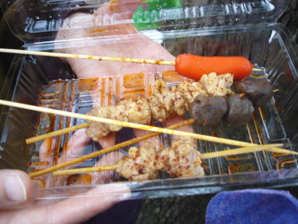 四川の串料理(って書いてあったけど料理名不詳)。鳥、コンニャク、ソーセージ、レンコン、しいたけ、鳥肝の中から好きなのを選んで、唐辛子鍋の中で煮てもらう。煮えたら取り出して唐辛子振りかけて完成。激ウマ♪